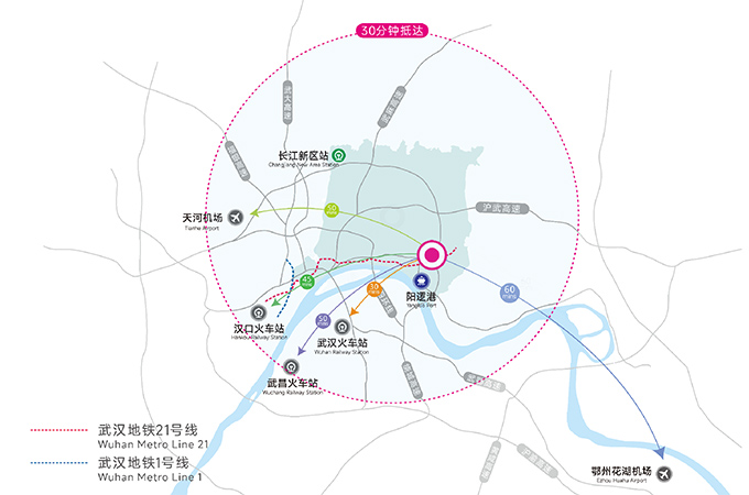 距武汉中心城区20公里,江北快速路、轨道交通21号线直达汉口,至武汉火车站仅30分钟车程,企业职工出行方便快捷。